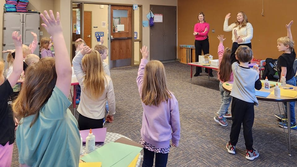 Lindsey Kriens (white sweater) asks preschoolers if they’d like to design a house for an animal.